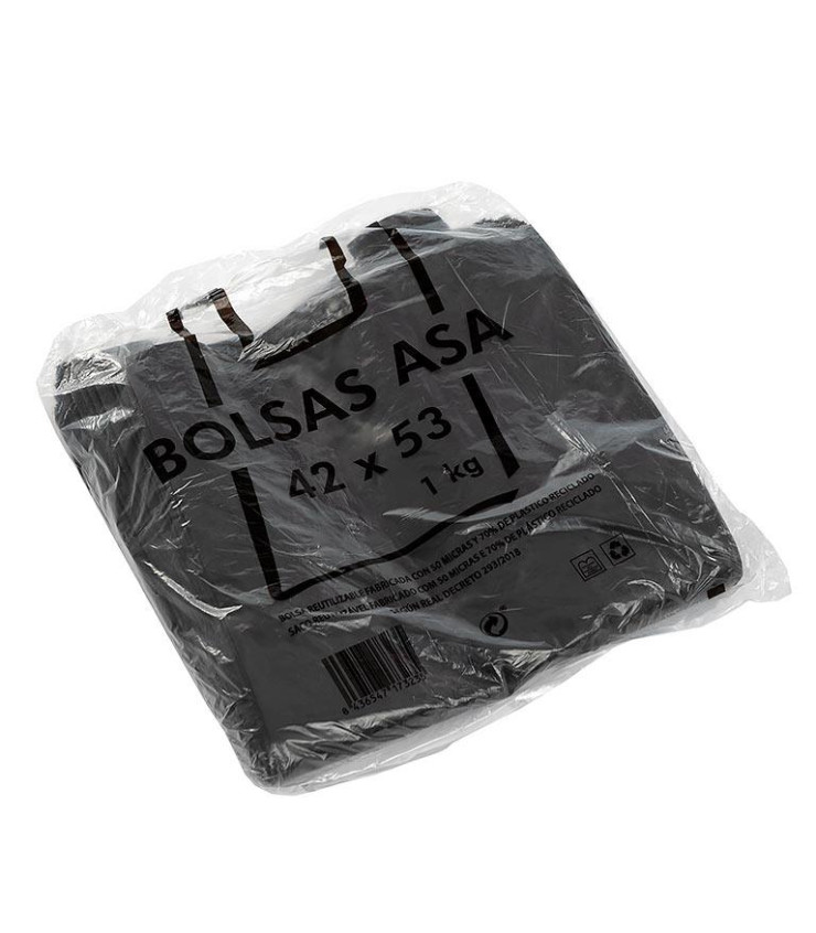 Kilos Bolsa Camiseta 50 my 70% reciclado 42x53 negra - UV: Paq 1 Kg - Caja 20 paq - Palet 36 cajas *